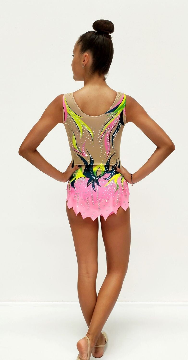 Este maillot de gimnasia rítmica es una explosión de color y estilo, ideal para gimnastas que buscan destacar en la pista con una imagen vibrante y enérgica. Su diseño se inspira en formas orgánicas con un patrón que simula hojas o llamas, en una paleta que combina rosa intenso, naranja, amarillo neón, verde y negro, aportando un efecto visual dinámico y llamativo.