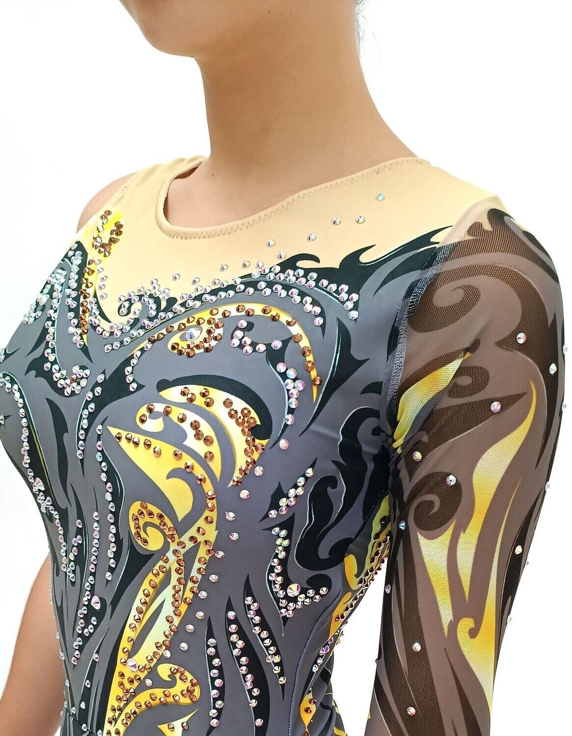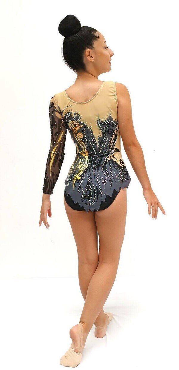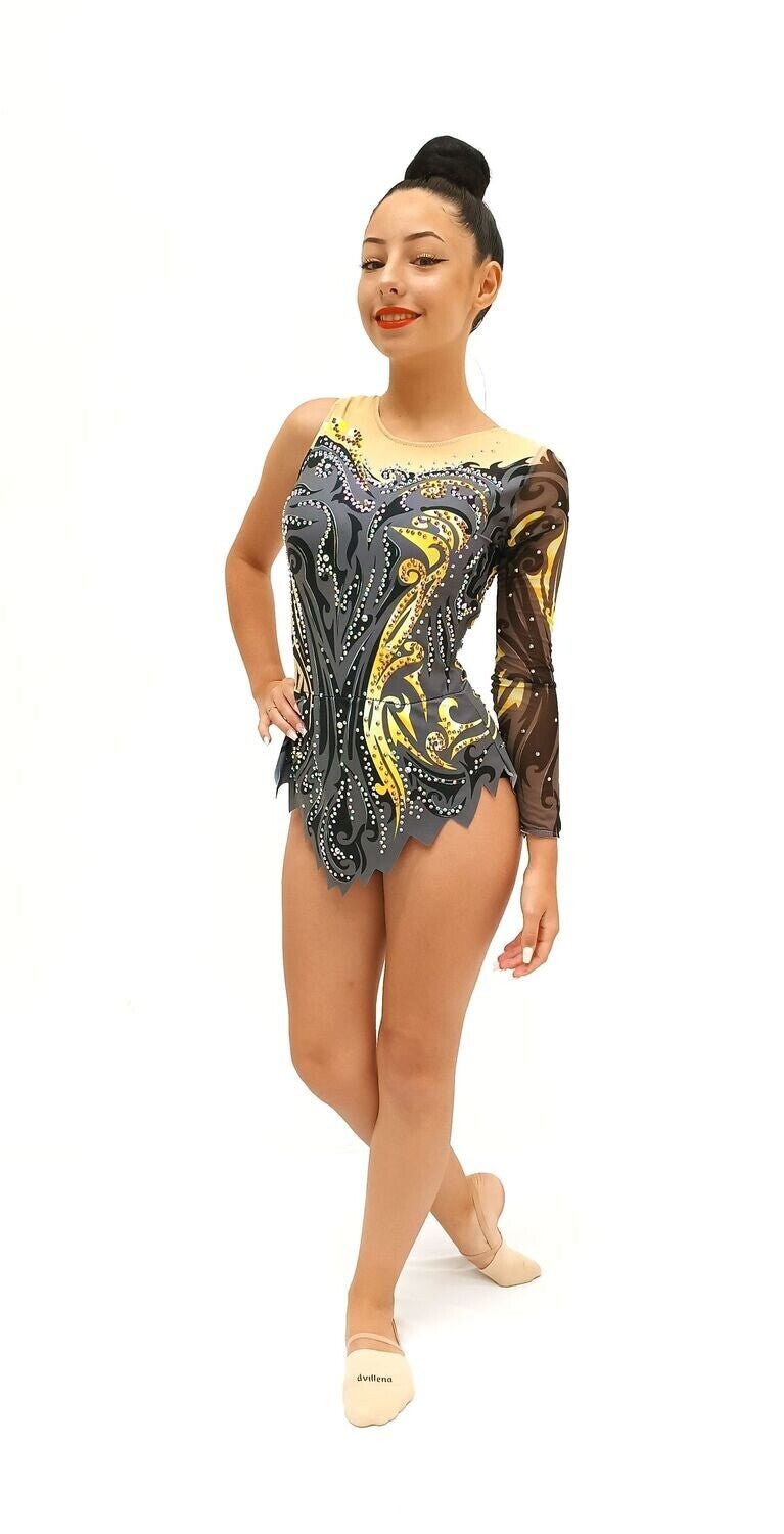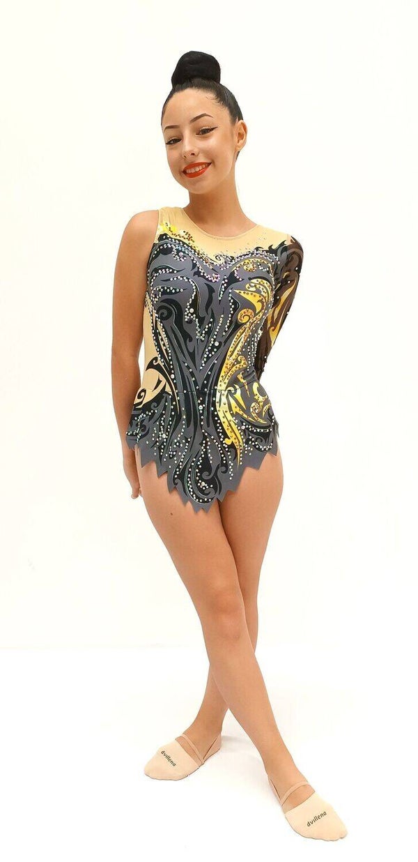 Impresiona en cada presentación con este maillot de gimnasia rítmica profesional, diseñado en tonosnude, negro y dorado, con un patrón artístico que combina elegancia y poder visual. Decorado con pedrería brillante multicolor, este diseño realza cada movimiento y aporta un toque de lujo y sofisticación.