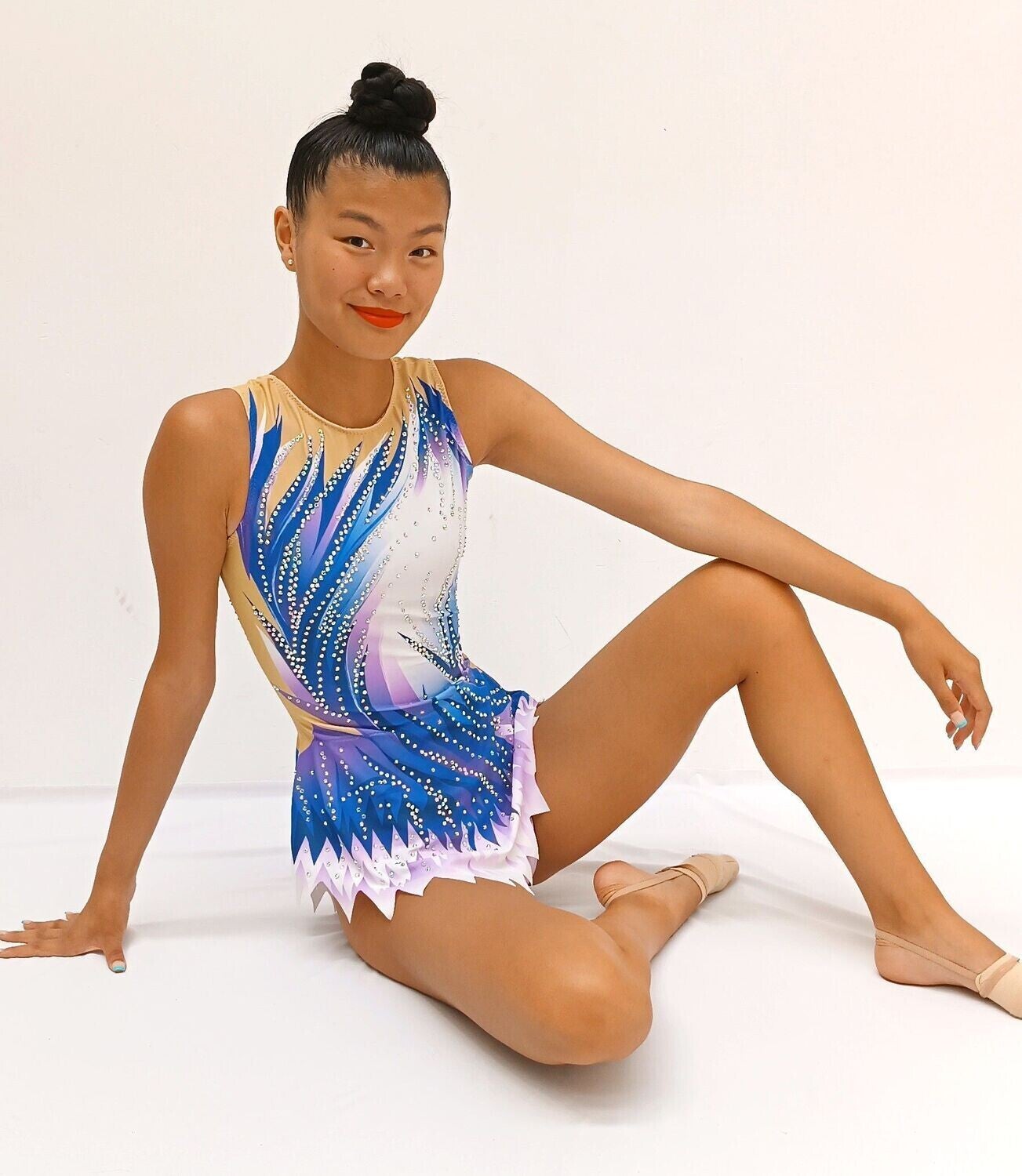 Este impresionante maillot de gimnasia rítmica ha sido diseñado para destacar en la pista gracias a su cautivadora combinación de colores y detalles brillantes. Con un elegante degradado de azul intenso a blanco, pasando por suaves tonos lila, este diseño evoca fluidez y energía, ideal para rutinas que combinan fuerza y gracia.