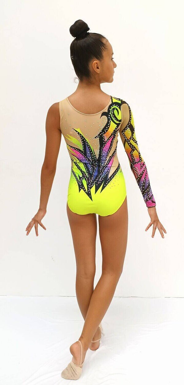 Este impactante maillot de gimnasia rítmica está diseñado para destacar en cada presentación. Su diseño asimétrico con una manga larga y otra descubierta aporta un estilo moderno y llamativo, ideal para gimnastas que buscan originalidad y elegancia. Los colores neón –amarillo, rosa y lila– combinan con detalles en negro para crear un efecto visual intenso que resalta sobre el tapiz.