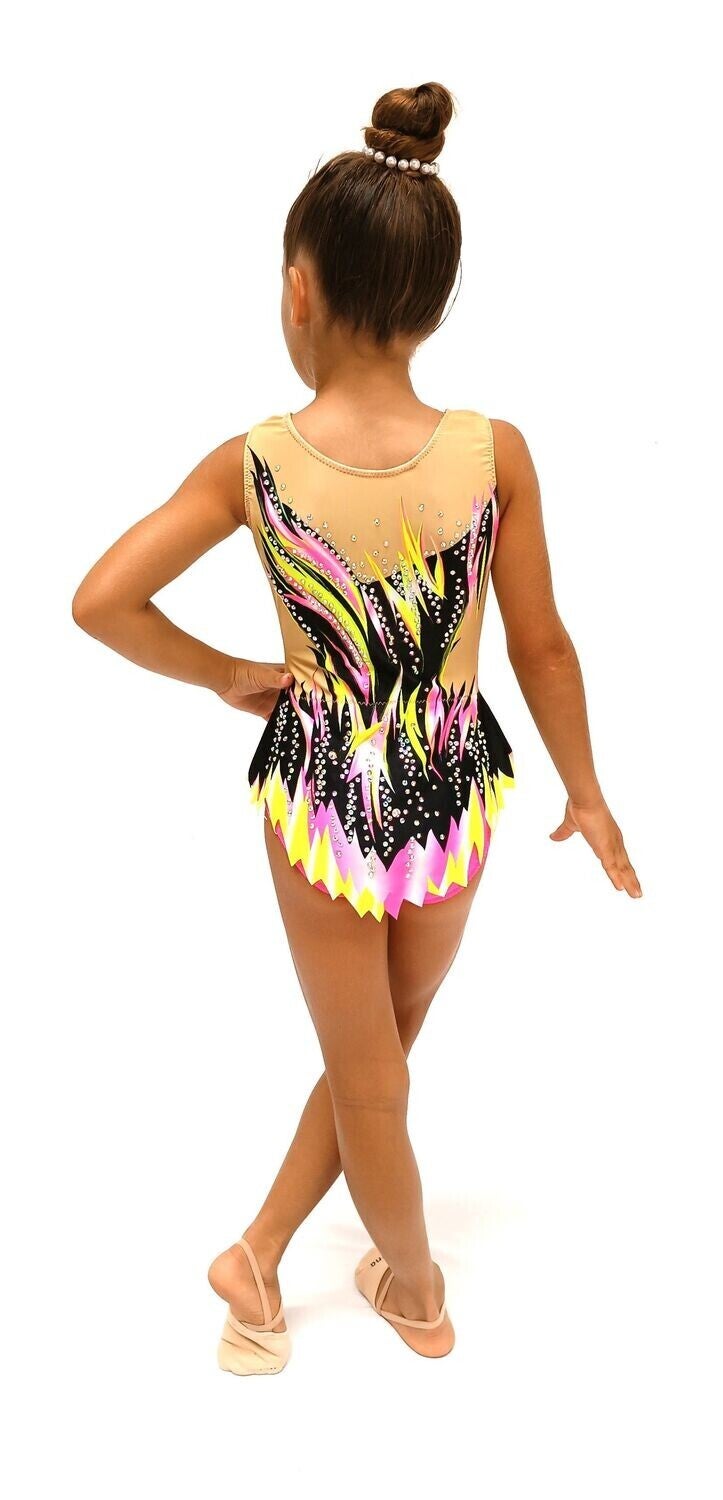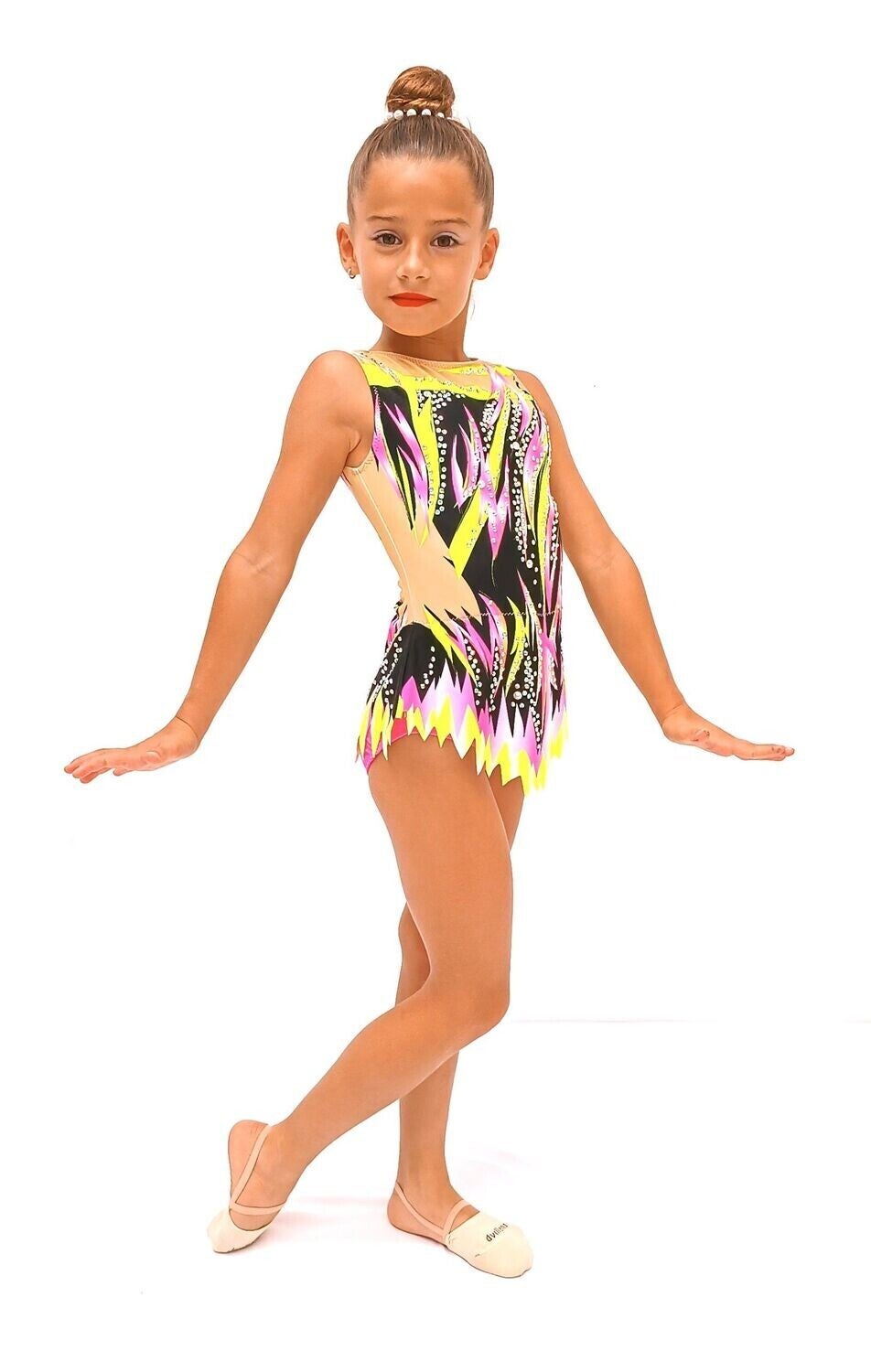Este impactante maillot de gimnasia rítmica destaca por su atrevido diseño en tonos rosa, amarillo neón y negro, complementado con detalles color nude que crean un efecto elegante sobre la piel. La pedrería brillante añade un toque de sofisticación y movimiento en cada rutina. Su corte sin mangas y falda en picos garantiza total libertad de movimiento y comodidad durante la competición o los entrenamientos.