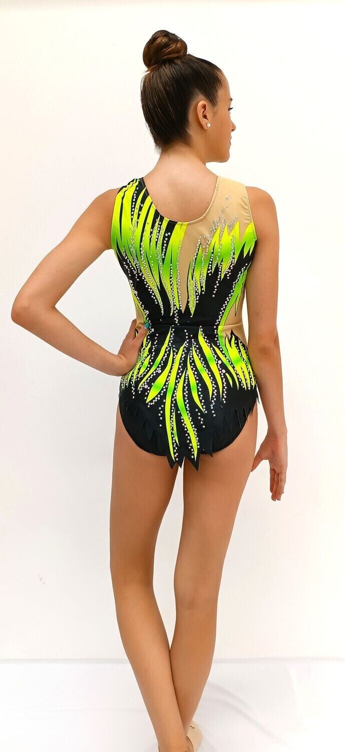 Este impresionante maillot de gimnasia rítmica combina tonos verde neón, negro y nude con un diseño dinámico tipo llama que resalta cada movimiento. Decorado con brillantes de alta calidad que aportan luz y sofisticación en el tapiz. Su confección en lycra elástica garantiza una perfecta adaptación al cuerpo, brindando comodidad, libertad de movimiento y un ajuste ideal para entrenamientos y competiciones.
