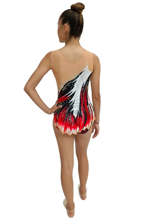 Impactante y lleno de energía, este maillot de gimnasia rítmica está diseñado para destacar en cada presentación. Su diseño en tonos rojo, blanco, negro y nude simula un efecto de fuego o plumas en movimiento, que en combinación con lapedrería brillante iridiscente crea una estética dinámica y poderosa.