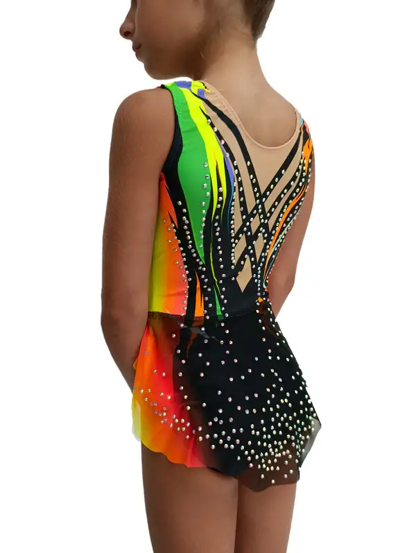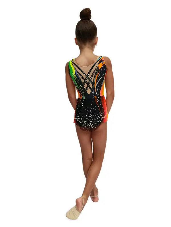 Este vibrante maillot de gimnasia rítmica multicolor es una auténtica explosión de energía sobre el tapiz. Con base negra y líneas en tonos neón (amarillo, naranja, verde, rosa y violeta), simula el efecto de movimiento constante. La pedrería brillante refuerza la luminosidad del diseño, mientras que el color nude en el escote aporta un acabado elegante y profesional.