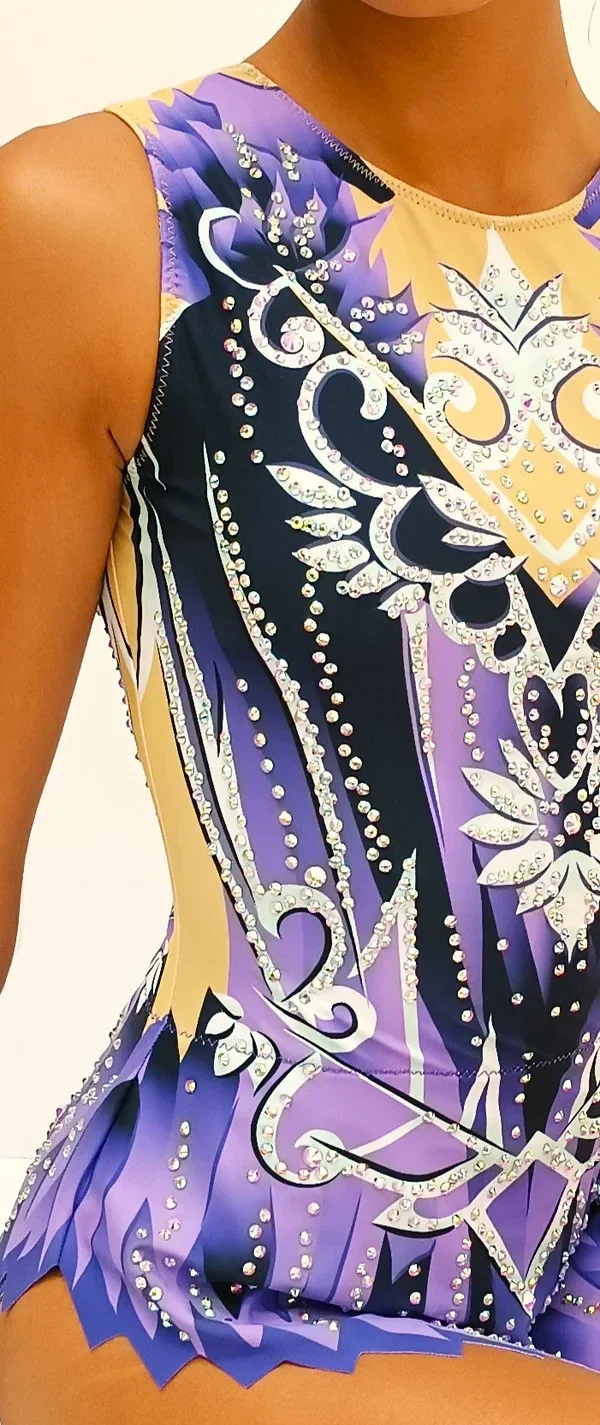 Luce deslumbrante en cada rutina con este maillot de gimnasia rítmica en tonos morado degradado con detalles blancos y plateados. Su diseño simétrico estilo ornamental, realzado con pedrería brillante, crea un efecto visual impactante en movimiento, ideal para competiciones de alto nivel.