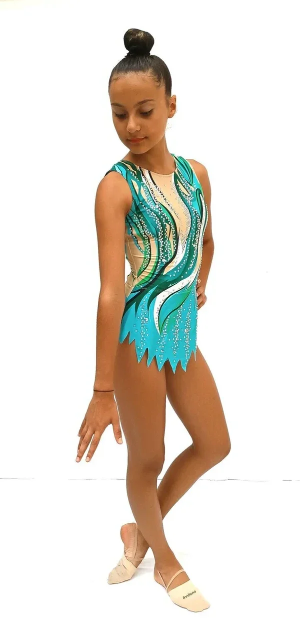 Este maillot de gimnasia rítmica destaca por su diseño fresco, elegante y lleno de energía, pensado para gimnastas que desean brillar tanto por su técnica como por su imagen en el tapiz. Su paleta de colores combina el verde agua con detalles en blanco, negro y nude, creando un efecto visual armonioso y natural que recuerda a formas vegetales en movimiento. El corte sin mangas y el escote redondo realzan la silueta y garantizan libertad total de movimiento en cada rutina.