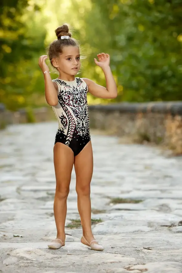 Este maillot de gimnasia rítmica es la combinación perfecta de elegancia, estilo y comodidad. Confeccionado en tonos nude y negro, presenta un diseño artístico inspirado en patrones florales y geométricos que aportan un look sofisticado y único. La pedrería brillante acentúa la silueta y añade un toque de luz que destaca en cada movimiento sobre el tapiz o escenario.